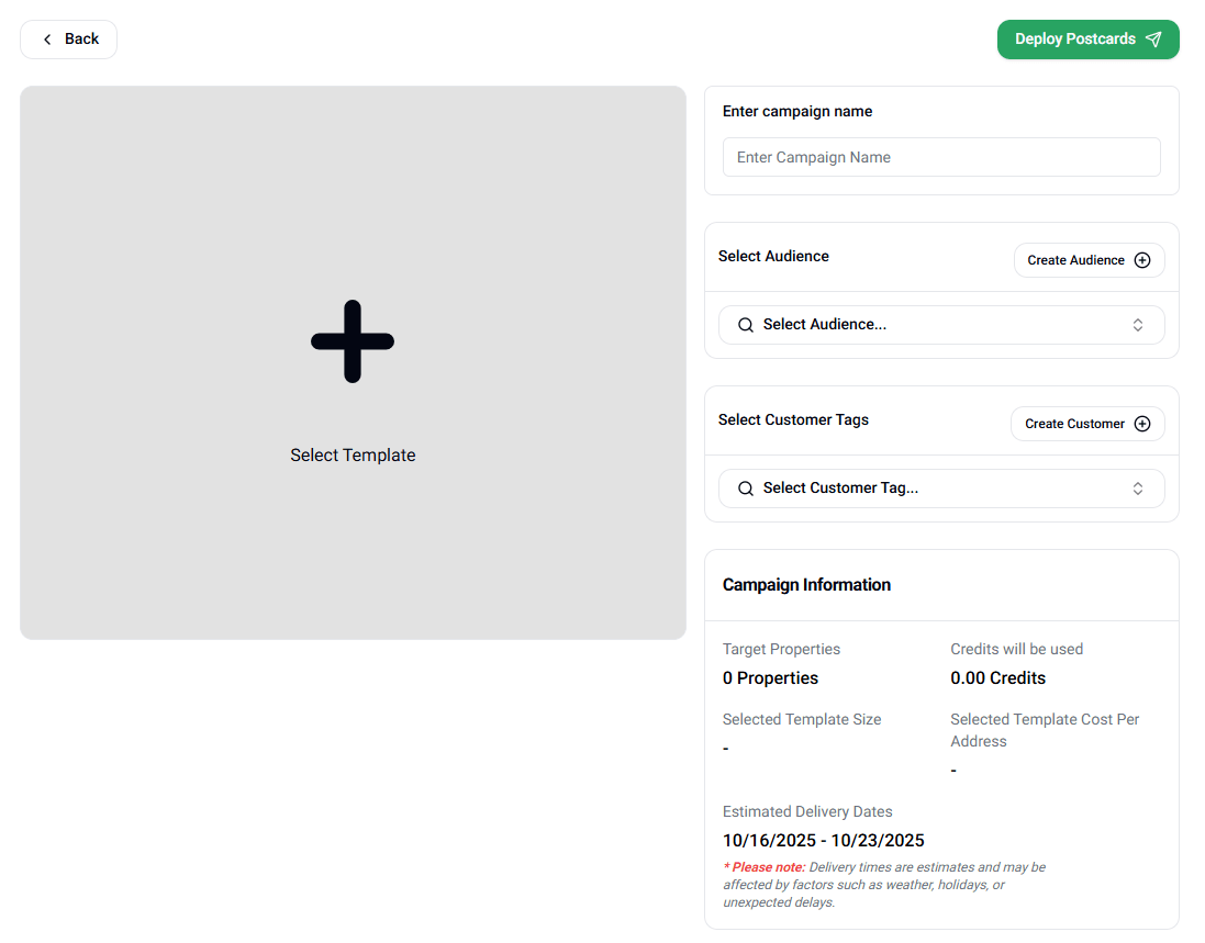 View the number of targeted properties, credits used, template size, and selected template cost per address. You can also see the estimated delivery dates.